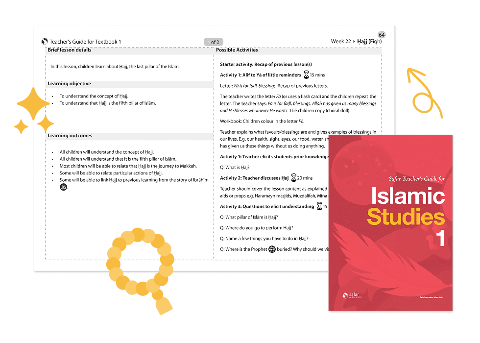 Designed by experienced madrasah teachers, Safar’s Teachers’ Guides reduce lesson planning time while raising the quality of delivery. With ready-made lesson plans, clear learning outcomes and engaging activity ideas, they help you teach with structure, purpose and ease — right from day one.