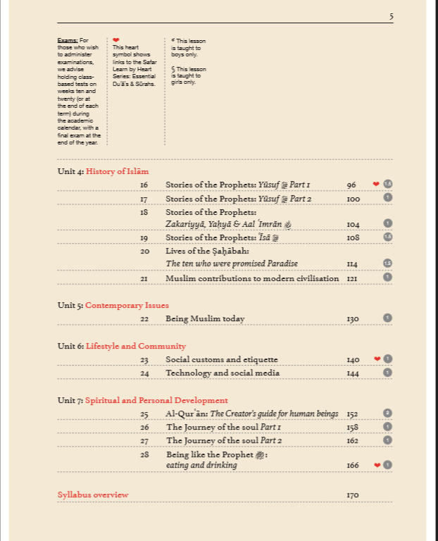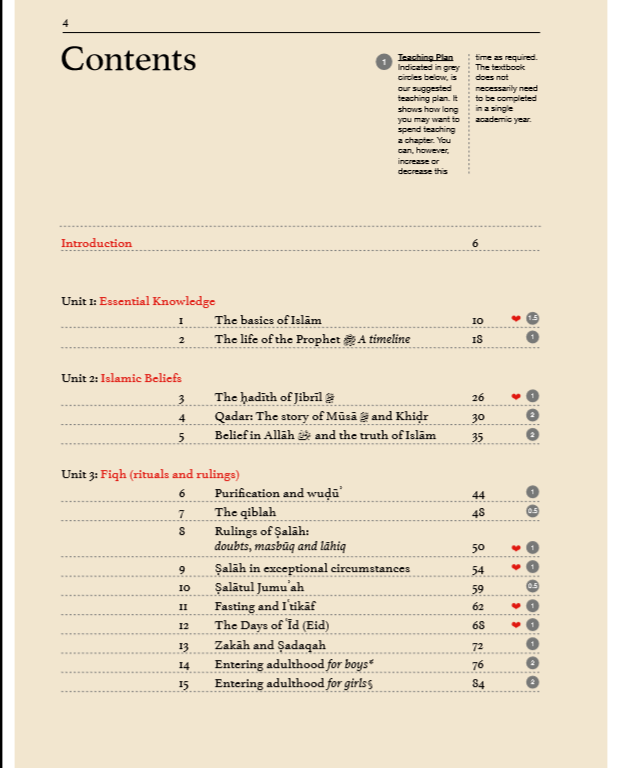 - The book follows a unit based structure, featuring units such as Essential Knowledge, Essential Beliefs, Fiqh (rituals and rulings), Islamic History, Contemporary Issues, Islam and the Social world and Spiritual and Moral development.